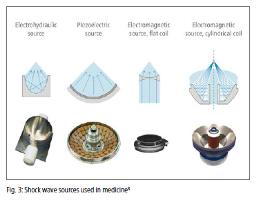 Fokuserede chokbølger kan genereres ved hjælp af elektrohydrauliske, piezoelektriske eller elektromagnetiske chokbølgegeneratorer (Fig. 3). Elektrohydrauliske systemer genererer chokbølger direkte ved kilden. Piezoelektriske og elektromagnetiske generatorer derimod genererer chokbølger som et resultat af bølgeforstærkning og overlejring, hvilket betyder, at bølgen kun dannes i fokalområdet