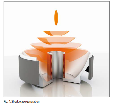 Fremgangsmåden ved elektromagnetisk generering af chokbølger er baseret på det fysiske princip for elektromagnetisk induktion. Dette princip anvendes også i højttalere. Elektromagnetiske chokbølgeneratorer muliggør præcis og forsigtig dosering af den påførte chokbølgeenergi, både aksialt (dybde) og sideværts. Ideelt set anvendes en cylindrisk spole, der fokuserer chokbølgerne ved hjælp af en rotationsparaboloid. På grund af den forholdsvis store åbning på chokbølgekilden i forhold til fokus, kan chokbølgeenergien indføres i kroppen over et stort område, hvilket medfører meget lidt smerte. Det meste af chokbølgeenergien frigives kun i det relativt lille fokalområde inden i kroppen (Fig. 4).