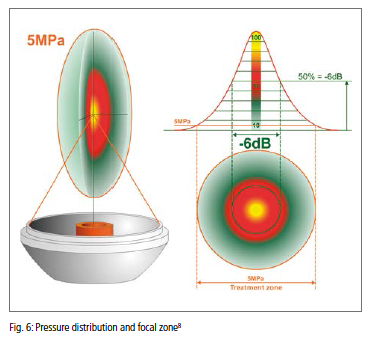 Det område, hvor chokbølgen producerer sine biologiske effekter, kan kun defineres, når der tages højde for det specifikke energiniveau. Med andre ord: chokbølgebehandlingsområdet indeni kroppen er ikke identisk med størrelsen af -6dB-fokalområdet. Det kan være større eller mindre. Det er derfor, der er defineret en ekstra parameter, som er tættere forbundet med chokbølgernes terapeutiske effektivitet, og som ikke er baseret på relative værdier (forhold til toptrykket i midten), men i en absolut mængde, nemlig 5 MPa tryk (50 bar). Derfor er 5 MPa fokusset defineret som den rumlige zone, hvor chokbølgetrykket er højere end eller lig med 5 MPa. Dette er baseret på den antagelse, at der findes en vis trykgrænse, under hvilken chokbølger ikke har nogen eller kun har minimal terapeutisk effekt.