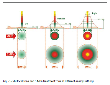 5 MPa-værdien understøttes ikke af videnskabelig dokumentation. Imidlertid afspejler ovenstående også ændringer i behandlingszonen som følge af ændringer i det valgte energiniveau. Forskellige terapizoner og deres ændringer med forskellige energiniveauer er vist i skematisk form i Fig. 7. I modsætning til behandlingszonen forbliver -6dB-fokusområdet i det væsentlige det samme, selvom energiindstillingerne ændres.