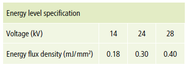De første chokbølgesystemer var udstyret med en elektrohydraulisk chokbølge generator. I modsætning til i dag blev energiniveauerne ikke angivet i mJ/mm2, men blev specificeret som spændingsværdier (kV). Nedenstående tabel viser typiske spændingsværdier (OssaTron) og de tilsvarende mJ/mm2.